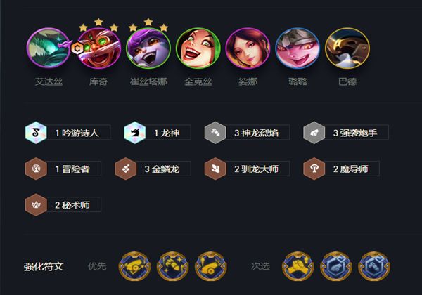 阵容组成有艾达丝,飞机,小炮,金克丝,琴女,璐璐,巴德。