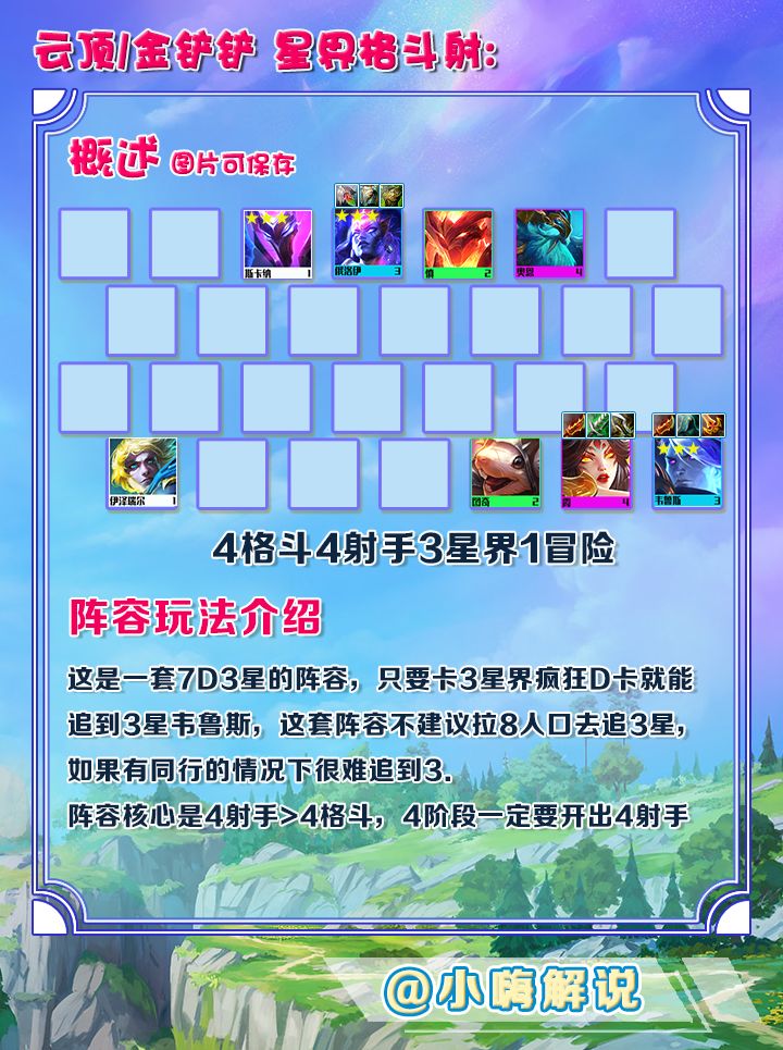 阵容组成:斯卡纳、伊泽瑞尔、图奇、韦鲁斯、俄洛伊、慎、奥恩、霞阵容羁绊:4格斗4射手3星界龙1冒险转职推荐:射手转>格斗转