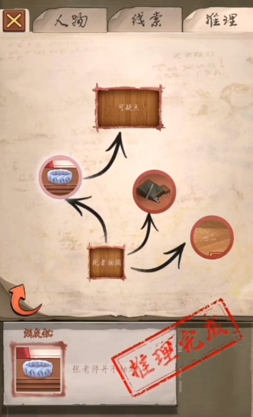 组合:1、死者抽烟=烟灰缸(张恨秋房间内)+香烟与火柴+地上的灰尘。