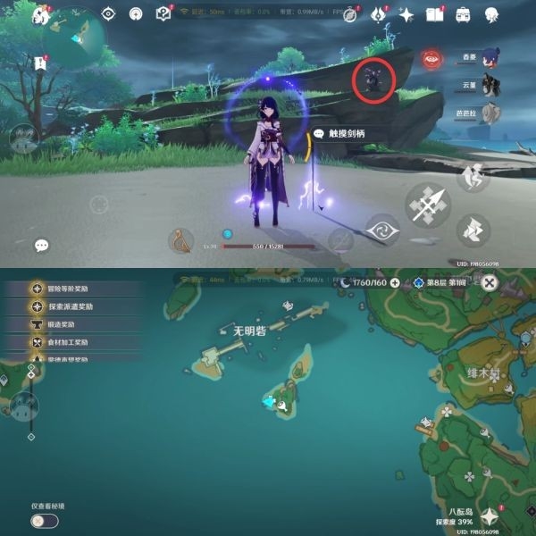 10、这个地方则需要解密,拿到雷种子按图中数字标的序号触摸。如果看不懂的话,可以游戏里面触摸雷灵,按雷灵触摸雷剑的顺序,触摸剑柄。之后出现两个武士。击杀即可获得一个华丽宝箱。