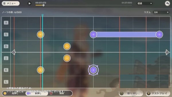 设置音符以及长度/强度来为每首歌创建谱面。自制完毕后,自己游玩并达到90%的完成率后即可分享给其他玩家。