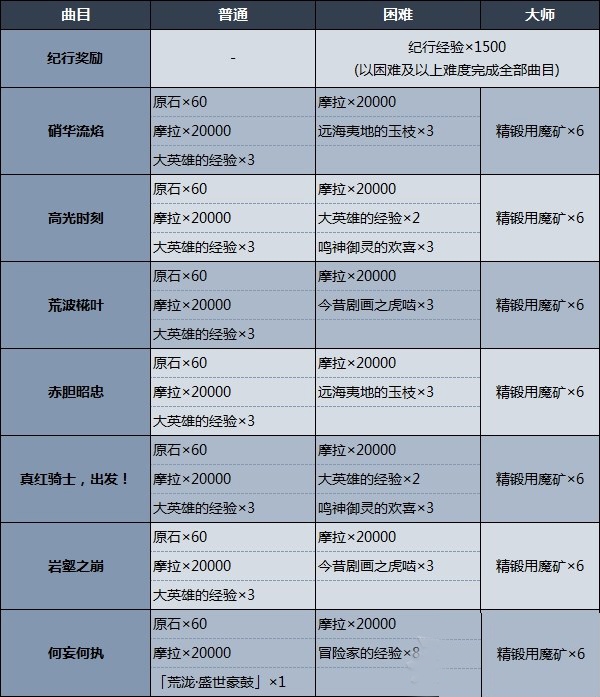 活动曲目分为普通、困难和大师三个难度,完成高难度挑战后可直接领取所有低难度挑战奖励。