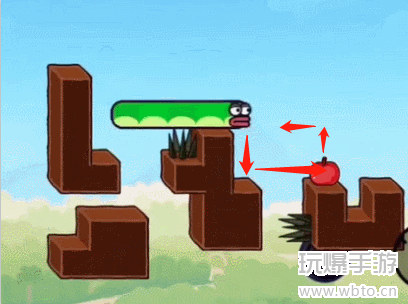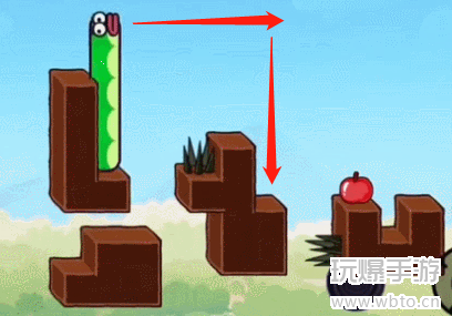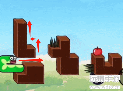 3、然后我们吃掉上边的苹果后,向右走到阶梯边,然后向上一直走,步骤如下图所示。