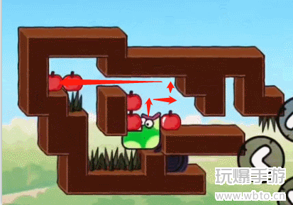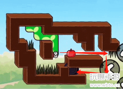 3、顺着阶梯下来吃掉两个苹果后左转吃掉最后一个苹果,然后顺着阶梯向下后向左即可进入黑洞。