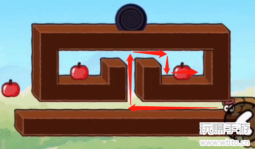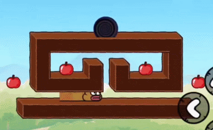 2、然后我们落下后向左移动,然后吃掉一边的苹果,吃掉两边就太长而出不来了,步骤如下图所示。