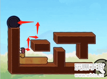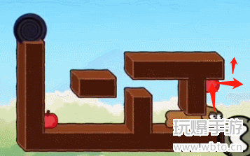 3、吃掉苹果后我们向上移动,移动到小阶梯,步骤如图所示。