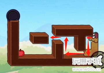 1、首先我们向上吃掉苹果后向右上移动身体,如下图所示。