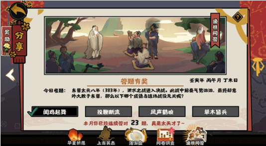 东晋太元八年(383年),淝水之战进入决战,此战中前秦气势汹汹,最终却意外大败于东晋,那么以下哪个成语与这场战役无关呢?无悔华夏渔樵问答6.23最新的问题以及答案目前已经是热腾腾的出炉啦!今日份的本题的难度依旧是不小的,可能对于不太了解历史知识的小伙伴们来讲,还不是很清楚吧,希望通过接下来小编的强力剧透,可以让大家很好的增长全新的姿势!