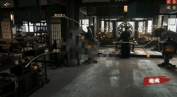 观察时需要查看左侧机密文件、擦剑老人、精神的高官和其佩剑。