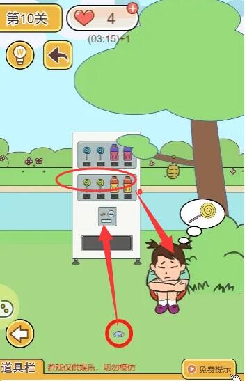 1、切换到右边的场景,点击拿起地上的一元钱硬币,投到自动售货机里面