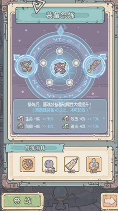 激活器魂后,可以消耗资源,对器魂装备进行祭炼,提升装备的攻击、防御、生命和追击四项基础属性,提升的属性永久保留,装备分解后,重新升级至器魂要求等级后,提升的属性将重新生效