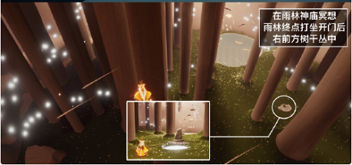 4、在雨林神庙冥想:在雨林神庙打坐开门后右前方树干从中的石碑前光圈处打坐并留言。