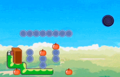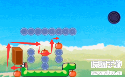 1、首先我们向右移动后踩在最右上角的苹果向下移动,步骤如下图所示。
