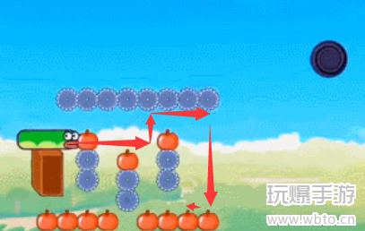 2、然后我们向下一格后向左一直吃苹果,步骤如下图所示。