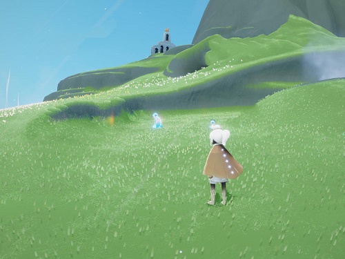 2、玩家穿过云野右侧云顶浮石来到圣岛后,飞到三层瀑布左侧的喷漆泉水就可以看到连体裤先祖了。