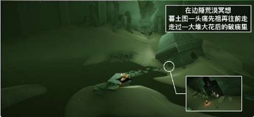 4、在边陲荒漠冥想:在暮土图一一大堆花前面的破庙内的石碑前光圈处打坐并留言。