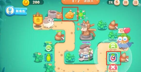 1.在上方鸡腿右边加一个风扇,右下角炮台清理道具