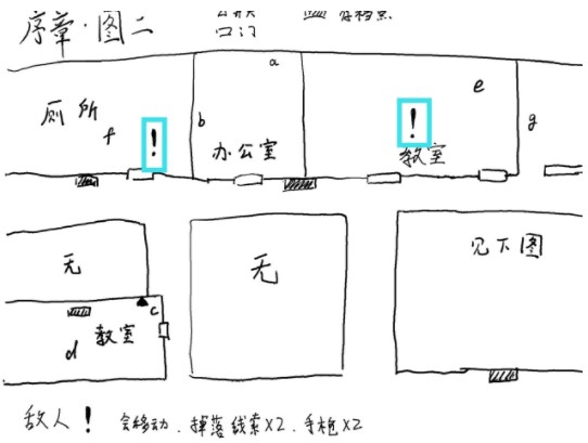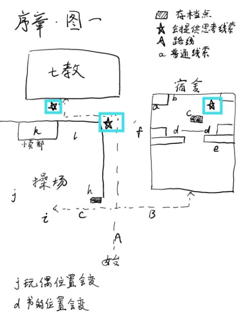 往左边的操场走可以先看到一个存档点和一个公告栏,没啥内容,但是闲的无聊可以看看。再往左有俩男同学在聊天,上前对话可以获得普通线索一条。左边长椅旁有一个玩偶,过去捡起会过一个意志判定并获得一个没有卵用的普通线索。玩偶的位置也会变动。