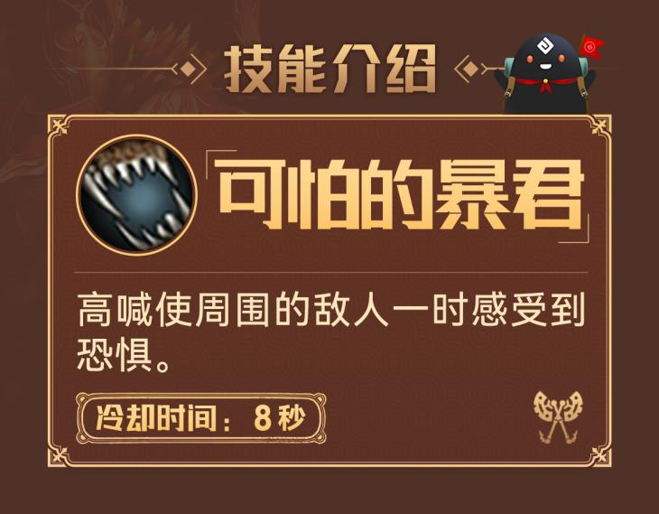 狂战士发出怒吼,使周围的敌人受到恐惧或嘲讽效果,技能释放时同样具有霸体效果;该技能是狂战士最·重·要的辅助技能,在pve中可嘲讽周围的怪物,吸引它们攻击自己,为队友分担压力;而在pvp中可以使对方陷入恐惧效果,并造成击倒效果,如果能在恰当的时刻使用,甚至可以扭转战局,反败为胜,“可怕的暴君”果然是名副其实!