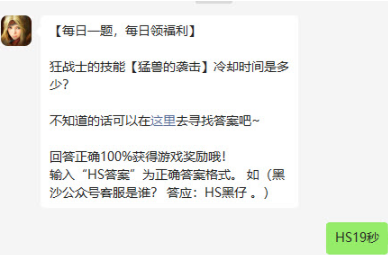 以上就是有关于狂战士的技能【猛兽的袭击】冷却时间是多少?黑色沙漠手游2022年07月18日微信每日一题答案更新的详细介绍啦,还没有获取到今日份游戏礼包的小伙伴们赶紧前去游戏领取吧!