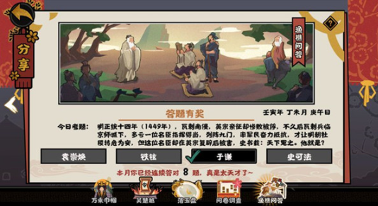 明正统十四年(1449年),瓦剌南侵,英宗亲征却惨败被俘,不久后瓦剌兵临京师城下,多亏一位名臣指挥得当,列阵九门,率军民奋力抵抗,才让明朝社稷转危为安,但这位名臣却在英宗复辟后被害,史书载:天下冤之。他就是?无悔华夏渔樵问答07.16最新的问题以及答案目前已经是热腾腾的出炉啦!今日份的本题的难度依旧是不小的,可能对于不太了解历史知识的小伙伴们来讲,还不是很清楚吧,希望通过接下来小编的强力剧透,可以让大家很好的增长全新的姿势!