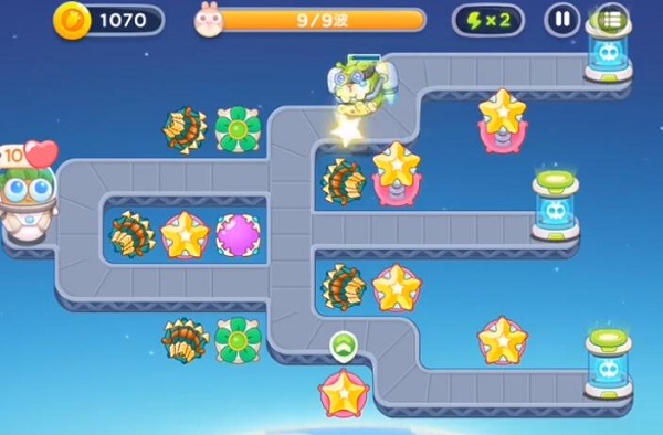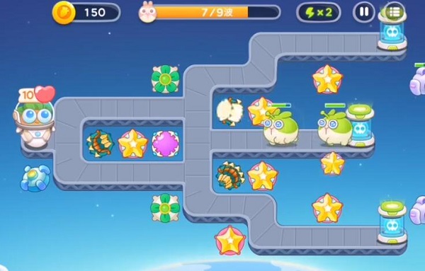 保卫萝卜4游戏全新的游戏章节——太空穿越章节的第十三关大家都有顺利的通过这一游戏关卡的考验吗?想要顺利的通过这一关的话,可以利用星星塔搭配风扇、分裂箭加一个电磁炮就可以啦!
