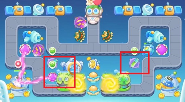 1.首先,开局左右两边各放置一个电磁炮,左边的升到满级,先清理道具,清理掉后放置一个火箭炮