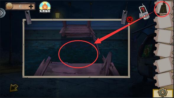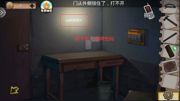 6、然后我们回下水道,用钥匙打开如图所示的锁,获得木板后去警卫室,用小刀划开垃圾桶,使用夹子即可得到湿纸片,放在警卫室灯上烘干即可获得下水道密码箱密码。