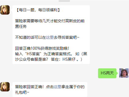 以上就是有关于冒险家需要等待几天才能交付高斯皮的前置任务-黑色沙漠7月25日微信每日一题最新答案的详细介绍啦,还没有获取到今日份游戏礼包的小伙伴们赶紧前去游戏领取吧!