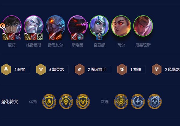 阵容组成为尼菈,男枪,狮子狗,乌鸦,齐亚娜,芮尔,厄斐琉斯。羁绊效果为4刺客6黯灵龙2炮手1龙神2风暴龙。强化符文选择刺客转,黯灵龙转,在一起更好,DD街区,战斗法师等。