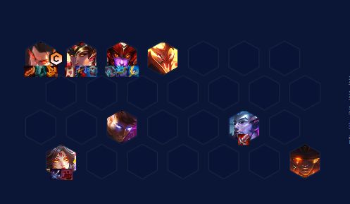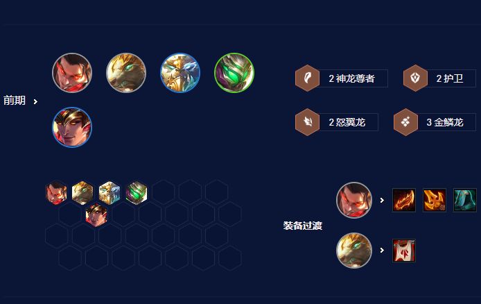 阵容组成为瑟提,洛,龙女,霞,亚索,人马,杰斯,赛纳。羁绊效果为8怒翼2神龙尊者2换形1龙神1冒险。海克斯可以选择实战训练,焦灼,勃然大怒,开摆,锻造炉,战力海克斯也可选择。