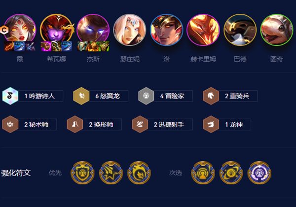 阵容组成为霞,龙女,杰斯,猪妹,洛,人马,巴德,老鼠。羁绊效果为1吟游6怒翼4冒险2重骑2秘术2换形2迅捷1龙神。海克斯选择冒险转,强攻,焦灼,战利品大师,装备升级等。