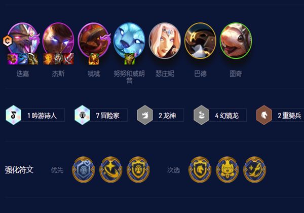 阵容组成为迭嘉,杰斯,呲呲,努努,猪妹,巴德,老鼠。羁绊效果为1吟游7冒险2龙神4幻境2中期。海克斯选择冒险转,马转,公理圆弧,星界赐福,猎杀律动,战力海克斯都可以选择。