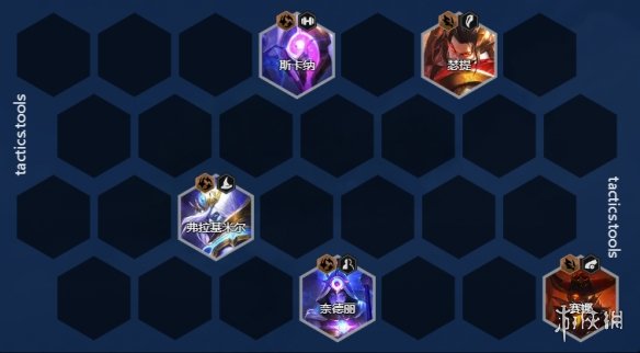 5/6阶段:完整阵容如下图,杰斯、亚索、赫卡里姆、希瓦娜、洛全员控制,配合反向站位的三凌风,基本无敌。
