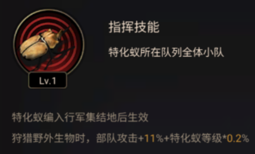 3、特化蚁部分特化蚁自身附带着辅助狩猎野外生物的技能;当编入行军集结地或是驻扎此特化蚁时,即可发挥其特有技能,如黄色龟蚁和橙红蚁。