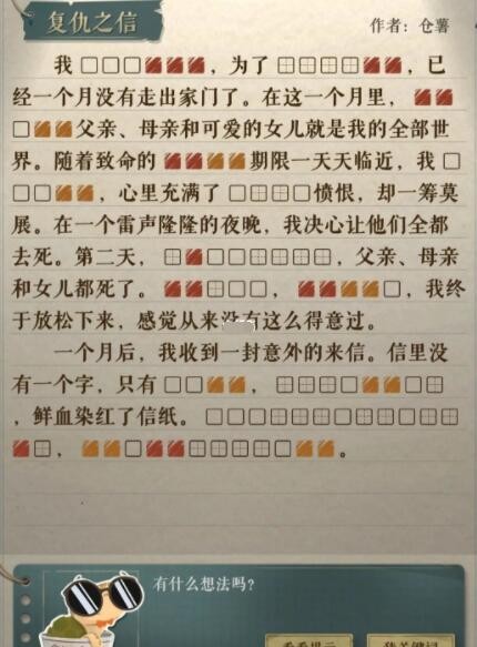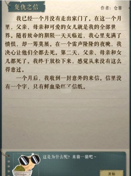 海龟蘑菇汤中的汤面很多都是有一定难度的,玩家想要顺利的通关,需要对故事完整的了解以及推理,在一定的问题下来获得最终的解谜,那么复仇之信这一关要怎么玩呢?让小编来告诉大家吧。