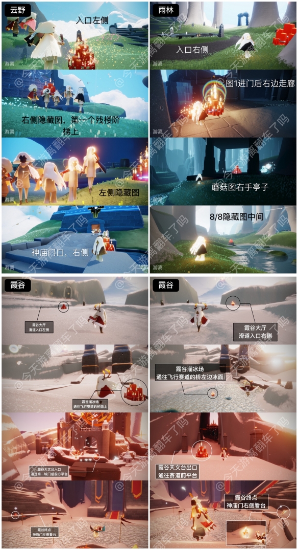 光遇今日大蜡烛分布在云野、雨林、霞谷,以下是位置参考: