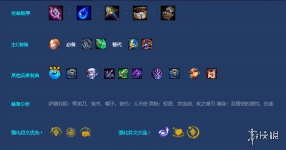 前期过渡:EZ、老鼠、蕾欧娜、狗头 开局抢水滴或者大棒,优先把青龙刀或者鬼书做出来打工。