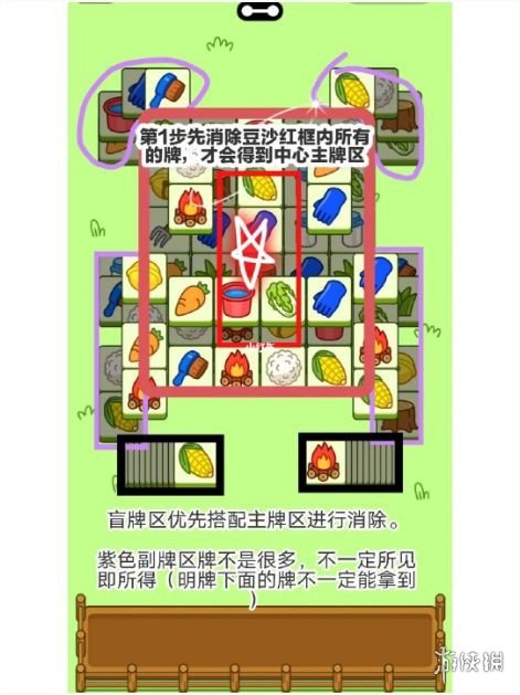 1、下图把大的框架和最后主牌区都给大家标出来了,我们就直接略过紫色副牌区开始消除所有可以看到的牌。