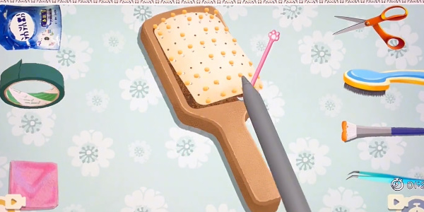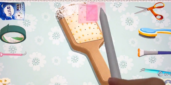 3、我们用粉色猫爪钩钩开梳子气囊,用镊子夹出里面的脏东西。