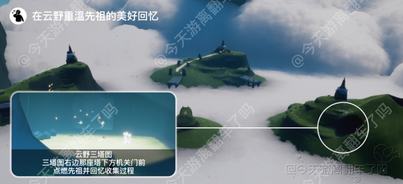 来到云野三塔图,如图所示有三个塔的图,任务先祖在云野中间的图,玩家到达先祖旁边,点燃他头上的点火标志。然后玩家根据游戏提示和先祖的行走轨迹就可以完成重温先祖回忆的任务了。