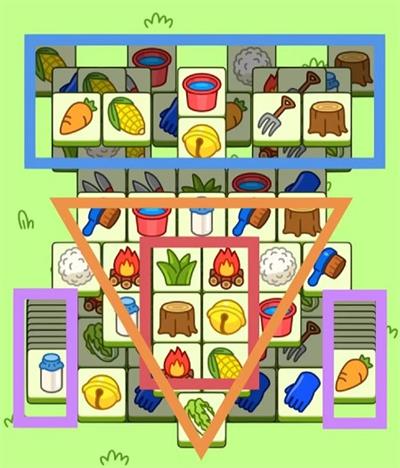 2.开局要先消除橙色区部分,把压在里面的牌显出来,然后按照从外到里消除红色区,尤其注意消除四个角部分。