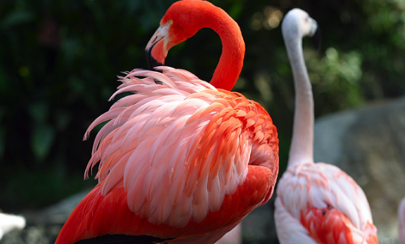 火烈鸟(学名:Phoenicopteridae),亦称红鹳。是鸟纲、红鹳科3属6种鸟类的通称。体高约80~160厘米,体重2.5~3.5千克。体型、大小似鹳;嘴短而厚,上嘴中部突,向下曲,下嘴较大成槽状;颈长而曲;脚极长而裸出,向前的三趾间有蹼,后趾短小而不着地;翅膀大小适中;尾短;体羽白而带玫瑰色,飞羽黑,覆羽深红,诸色相衬,非常艳丽。