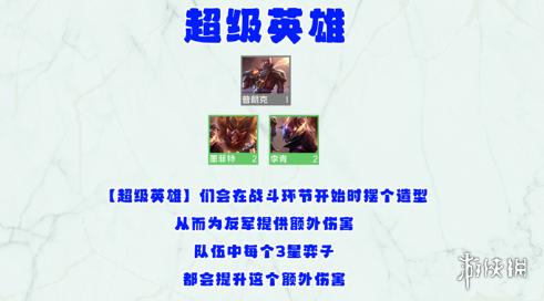 [超级英雄]们会在战斗环节开始时摆个造型,从而为发军提供额外伤害队伍中每个3星弈子都会提升这个额外伤害。