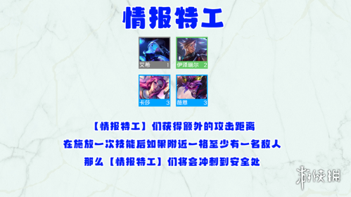云顶之弈s8的众多羁绊当中,有不少是新的羁绊,其中情报特工这个羁绊有着非常多的英雄,玩家在获得情报特工羁绊后,想要用它们来组合,那么下面小编就来告诉大家所有情报特工羁绊的英雄和效果吧。