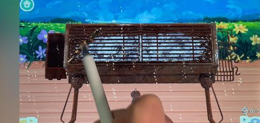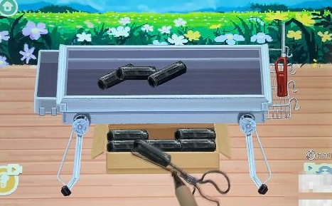 5、最后我们组装好烧烤架,放碳用喷火枪点燃,放上烧烤架和肉串即可过关。