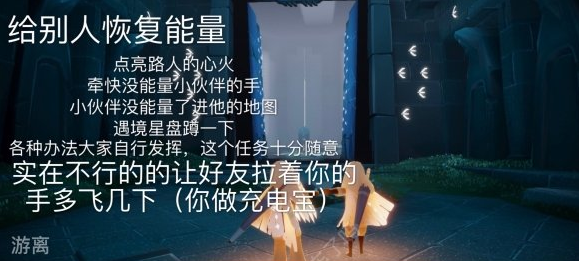 牵着好友的手一起进入地图是完成此任务最方便的方法,可以瞬间传递能量。在进入地图的一瞬间都是没有能量,但是和好友一起进图,好友就可以给你传递能量。