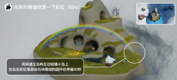 进入雨林地图,朝着右边的云层上方飞过去,穿梭过云洞,来到风之大道季节地图,朝着主岛飞过去,降落在草地上,在瀑布上找到彩虹,来到白蜡烛堆中,观赏彩虹60秒中,到时间后任务就完成了。