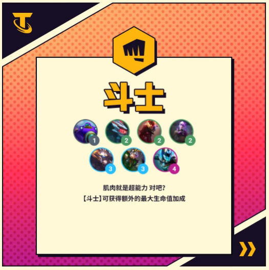斗士这个羁绊相信各位玩家斗士非常熟悉的,在很多的版本当中都是存在的一个羁绊,那么在金铲铲之战s8当中,斗士羁绊的具体效果以及包含的英雄有哪些呢?让小编来告诉大家吧!