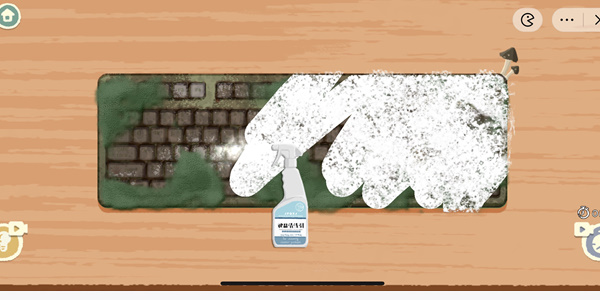 8、最后我们拿纸巾把键盘里擦干净,点击键盘小蘑菇就会消失,扣键零件会复原就过关了。